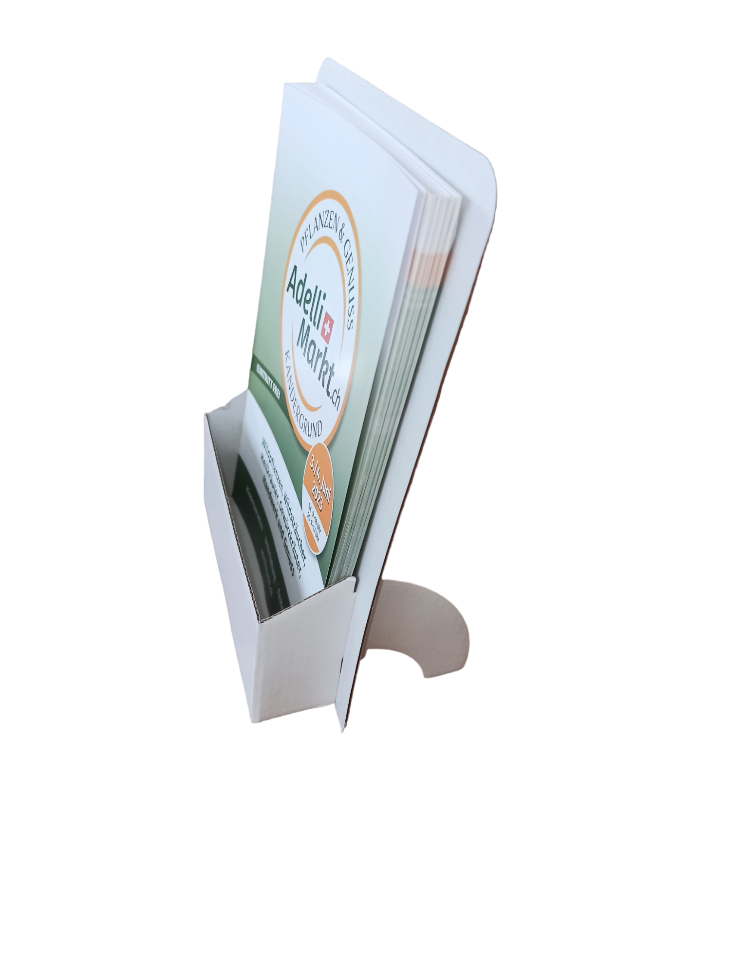 Der praktische Display Tisch Flyer Halter A5 aus Karton wird im Schnittmuster versendet und kann leicht selbst gefaltet werden. So ist der Prospekthalter sofort und überall bereit zum präsentieren der Flyer. Sechser-Pack. Kann auf Anfrage auch für schmalere Formate bestellt werden.